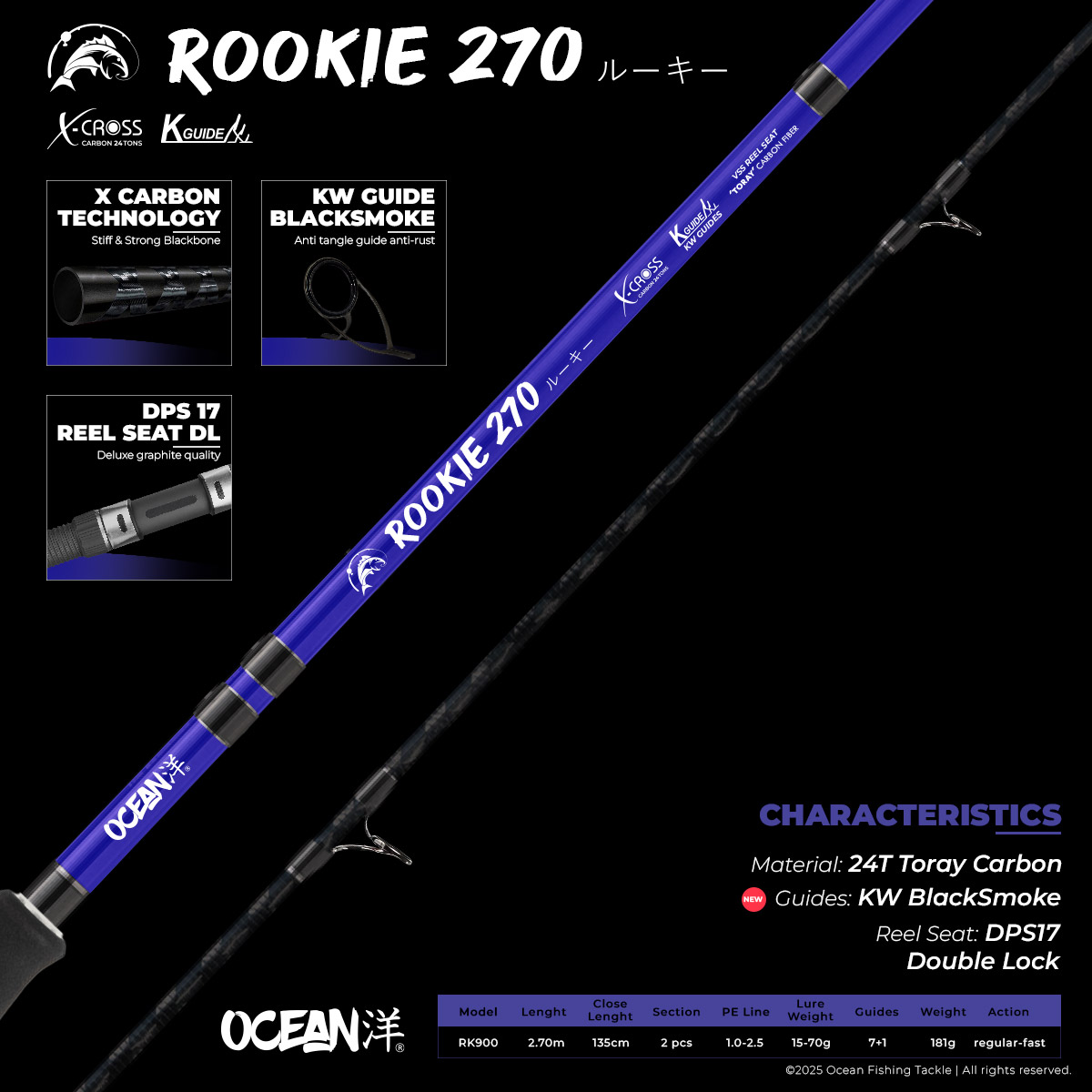 La Ocean® Rookie 270 es una caña ideal para Spinning. Fabricada en fibra carbono Toray de 24 tons, brinda una mayor acción y sensibilidad a la hora de pescar, cuenta con dos tramos y solo pesa 181 g. Las anillas son del tipo KW BlackSmoke y el porta-carrete DPS. El rango de lanzamiento es 15 a 70 g, ideal para la pesca de peces depredadores con señuelos o realizar pesca variada con anzuelos y carnada. Incluye una funda de tela para su protección y transporte.