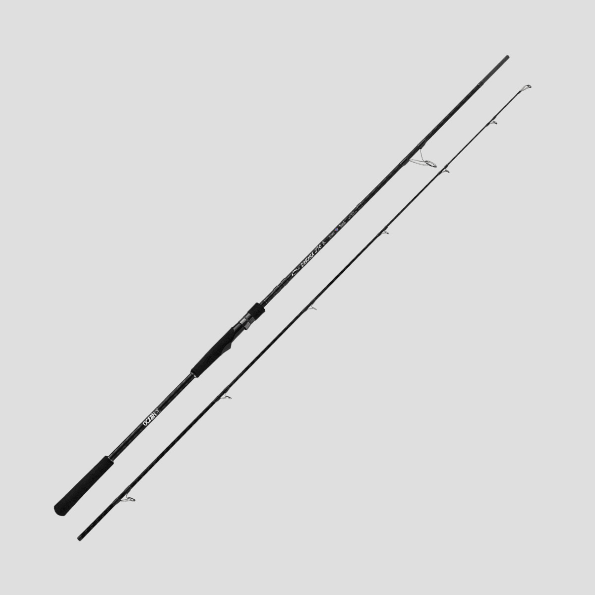 Caña inical de la marca Ocean® . Modelo Sakana 902 presenta un blank de fibra de carbono «Toray» trenzado de 24 tons, con una altura de 2.70 m y dividido en 2 cuerpos para mejor transporte, con un peso de tan solo 187g.