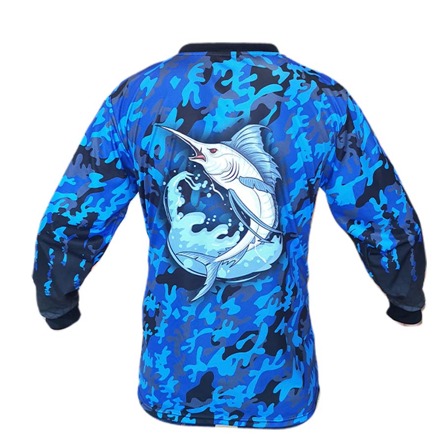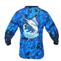 El polo Mundo Pesca® Blue Camo es fabricado con tecnología Dri-FIT, tela suave, respirable y elástica para un mejor confort, absorbe la humedad, no genera malos olores y es de secado rápido. Diseñado para el pescador moderno que busca la máxima protección solar, gracias a su filtro UPF 30, solo filtra el 1/30 de los rayos UV. Tu también protégete del sol con este moderno polo de Pesca. Además, cuenta con un diseño camuflado inspirado en los colores del mar, con un elegante pez Merlín en la espalda.